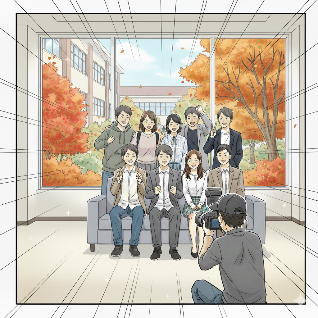 撮影場所は、3階の窓から外の景色がよく見える開放的な空間。10月も下旬に入り、窓の外には少しずつ色づき始めた木々や、葉が落ち始めた木々が見え、秋の深まりを感じさせます。ソファには教員と女子学生2名が座り、残りの学生がソファの後ろと横を囲むように立って撮影に臨みました。カメラマンさんの声かけで、皆、自然で素敵な笑顔を見せてくれました。